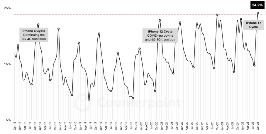- 애플의 글로벌 스마트폰 판매량 기준 시장점유율은 10월 24.2%를 기록하며 월 단위 기준 역대 최고치 경신