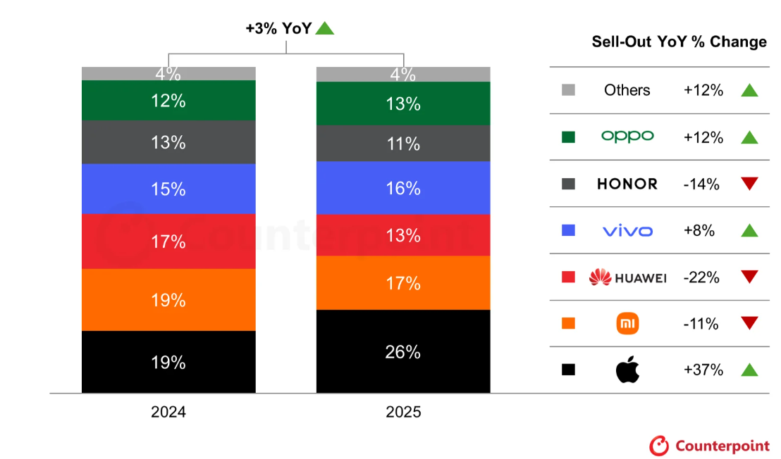 샤오미는 샤오미 17 시리즈가 예년보다 한 달 앞서 출시되면서 판매 정점이 앞당겨진 데다, 기존 모델들의 성과가 부진해 전년 대비 11% 감소했다.