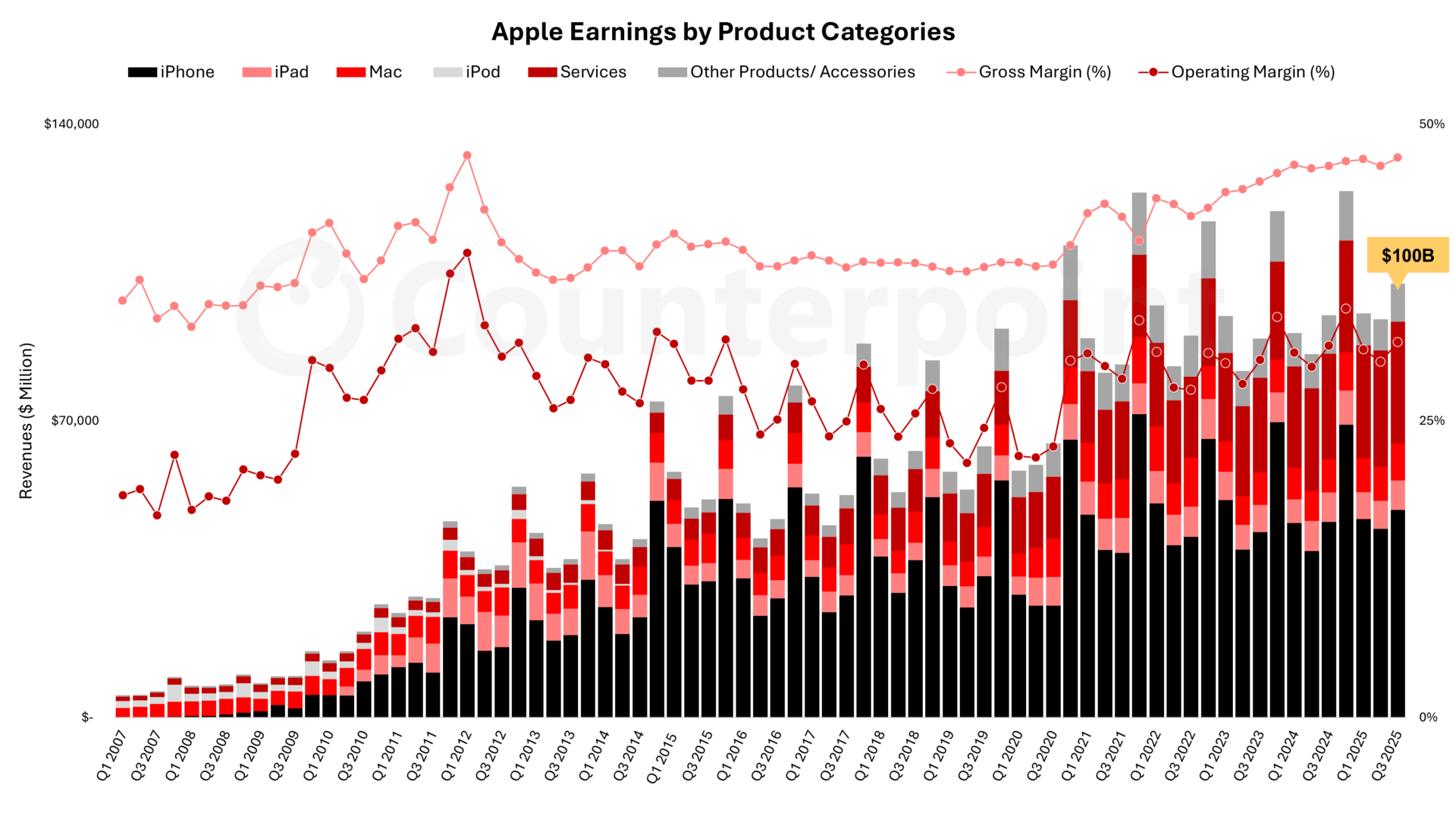 서비스 부문은 9분기 연속 두 자릿수 성장세를 이어가며, 애플 회계연도 기준 처음으로 연간 매출 1,000억 달러를 돌파했다. 카운터포인트의 타룬 파탁(Tarun Pathak) 리서치 디렉터는 “서비스 부문은 이제 애플의 매출 성장과 수익성 확대를 견인하는 핵심 축 중 하나로 자리 잡았다”며 “스토리지, 결제, 보험, 엔터테인먼트 등 주요 사용 영역 전반에서 서비스가 유기적으로 통합되며 애플의 생태계 경쟁력이 더욱 강화되고 있다”고 밝혔다. 그는 이어 “소비자 조사 결과, 아이폰 사용자들의 서비스 이용률이 꾸준히 상승하고 있으며, 신흥시장에서 아이폰 보급률이 높아질수록 서비스 부문 역시 동반 성장할 것으로 전망된다”고 덧붙였다.