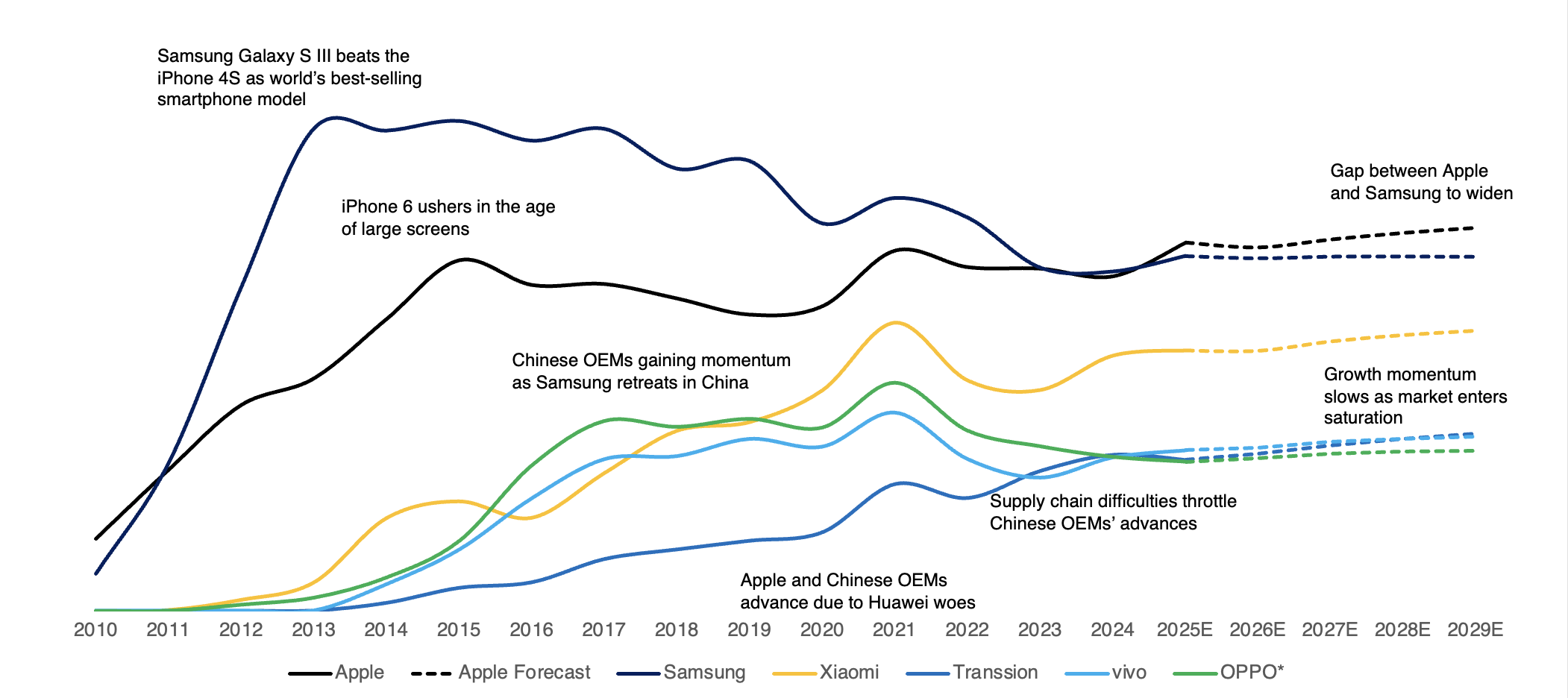 - 애플은 14년 만에 처음으로 출하량 기준 삼성전자를 제치며 2025년 시장 1위에 오를 것으로 예상되며, 이 우위는 2029년까지 유지될 전망.