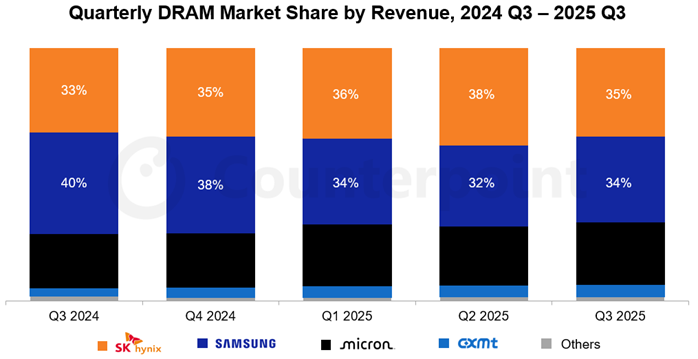 - 2025년 3분기 전세계 D램 시장에서 SK 하이닉스가 매출액 기준 35%의 점유율로 시장 1위 유지