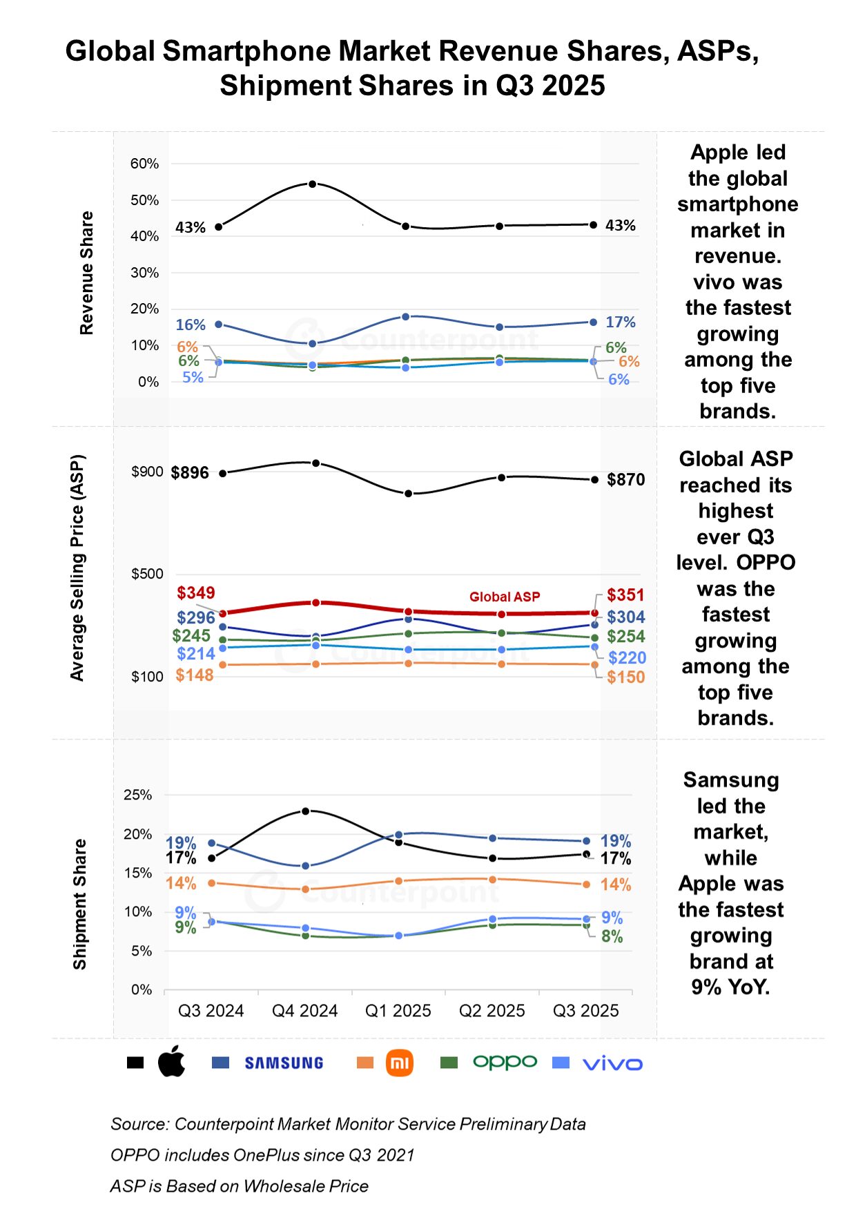 2025년 3분기 전세계 스마트폰 시장 매출 점유율, ASP, 출하량 점유율