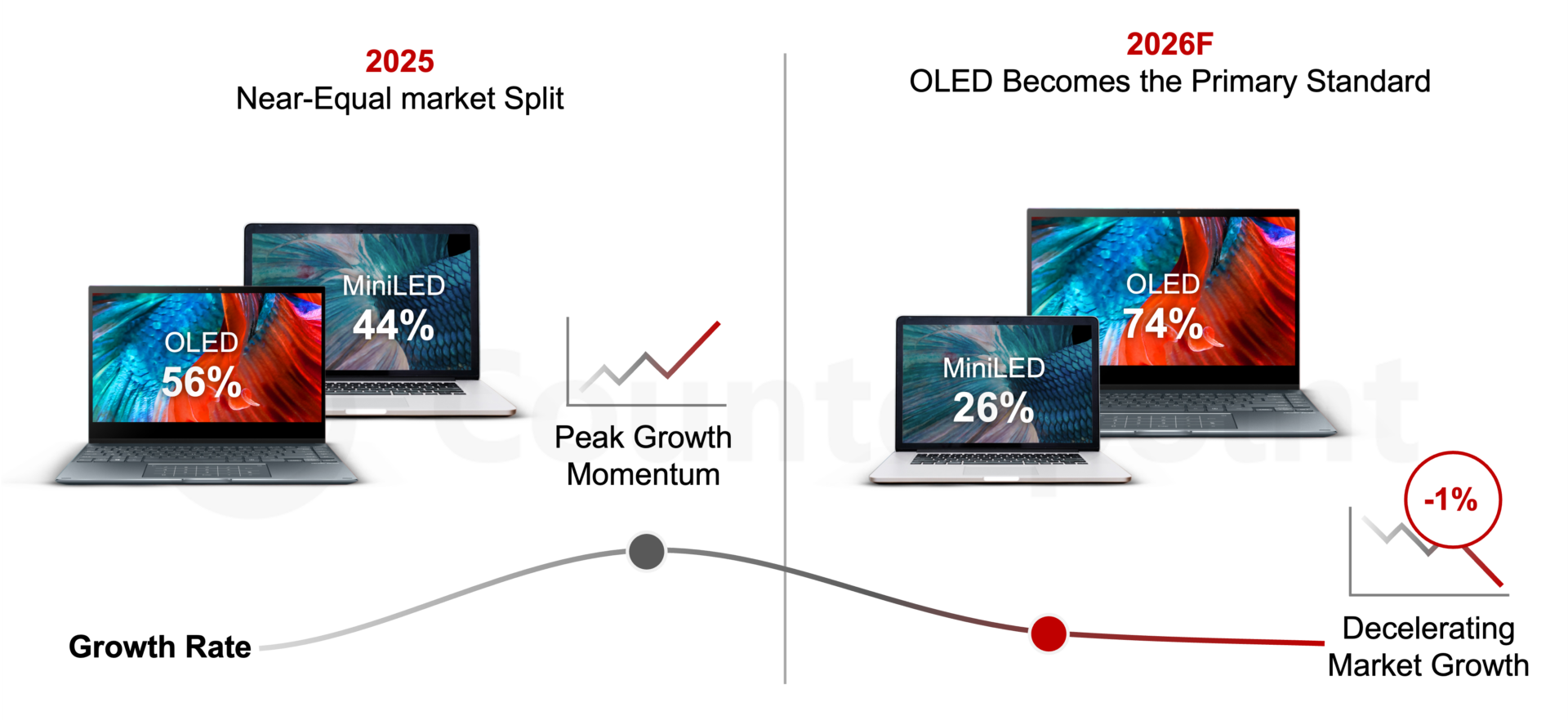 데이비드 나란호(David Naranjo)카운터포인트 연구위원은“2025년은 선제적 재고 확보와 기업용 교체 수요에 힘입어 강한 성장세를 보였지만, 2026년에는 메모리 가격 상승이 OEM의 제품 구성과 가격 전략에 부담으로 작용하면서 시장이 정상화 국면에 진입하고 있다”고 밝혔다. 또 “특히 애플의 맥북 프로에 OLED가 적용될 것으로 예상되면서 OLED 성장세는 더욱 탄력을 받고 있다”며 “OEM들이 전체 제조사 출하 기준 둔화 속에서도 성능, 전력 효율, 폼팩터 혁신을 통한 차별화에 집중하고 있음을 보여준다”고 설명했다. 이어 “장기적으로 OLED는 프리미엄 노트북 시장에서 LCD와 MiniLED의 점유율을 점진적으로 대체해 나갈 것”이라고 내다봤다.