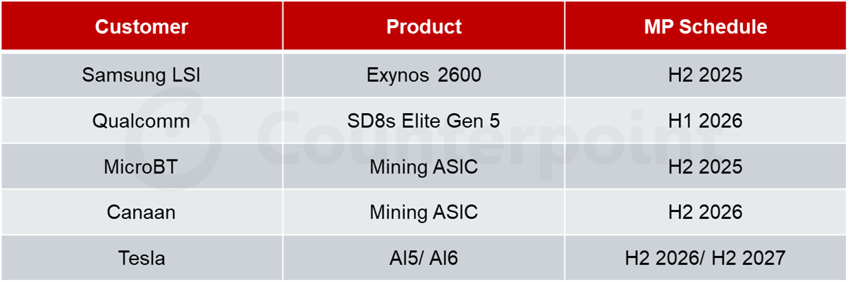 • 초기 SF2 수요는 삼성 LSI의 엑시노스 2600, 마이크로BT의 채굴 ASIC, 퀄컴의 스냅드래곤 8s 엘리트 5세대, 카나안(Canaan)의 채굴 ASIC 등 주요 고객사 제품을 중심으로 형성